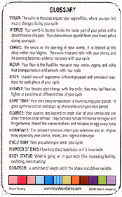 As cartas do Glossário vão definir e explicar quais são os órgãos envolvidos no ciclo de uma mulher, ou seja: os seios, útero, colo uterino e as suas secreções, a vulva, ovários, hormonios e a sua temperatura basal . É importante notar que é melhor checar a sua temperatura na mesma hora cada dia , e comparar com os dados das cartas do ciclo.